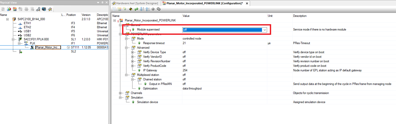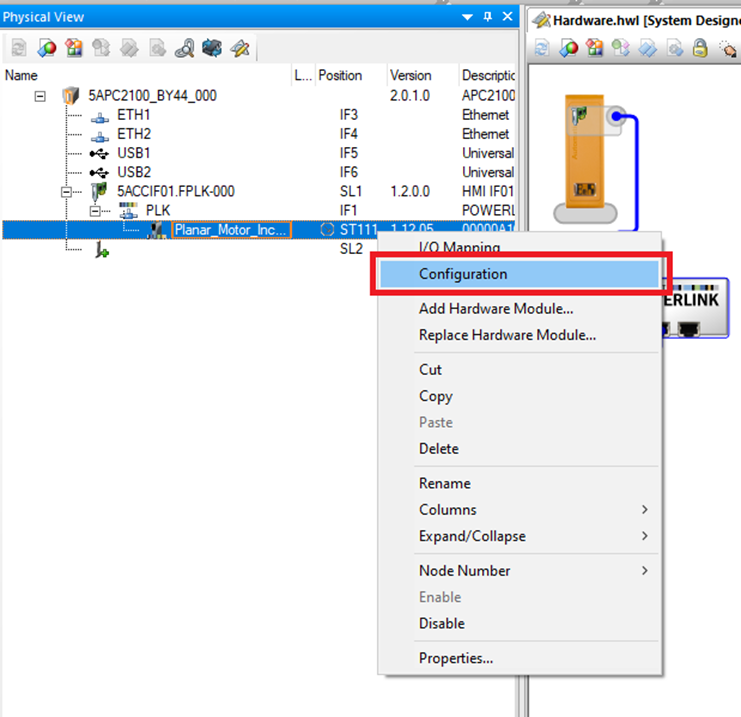 Step 9: Right click the Planar Motor Incorporated Powerlink Module and click "Configuration"