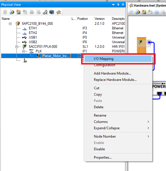 Step 5: Go to the Physical View and right click on the Planar Motor Incorporated Powerlink Module and click I/O Mapping