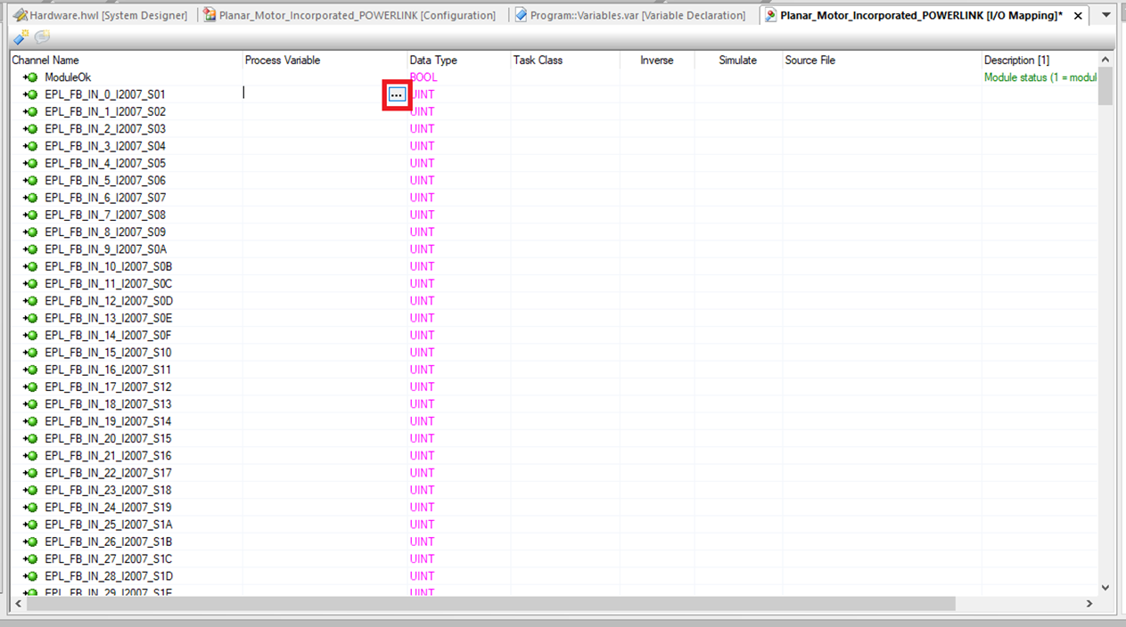 Step 9: Then you need to do the same for the FB_OUT elements. These elements will be mapped to the corresponding elements in the fieldbus out array. For the first element click the .. In the Process Variable column