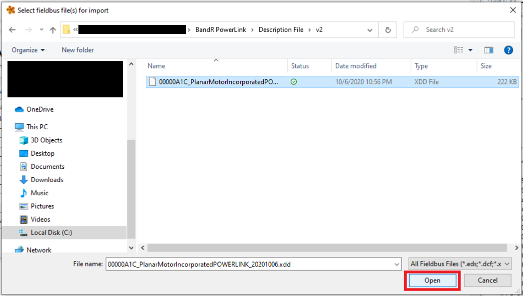 Step 3: In the Select fieldbus file(s) for import window browse to the included .xdd file and click "Open"