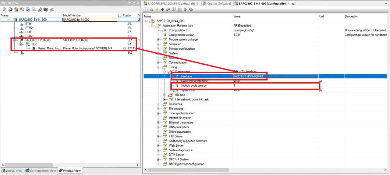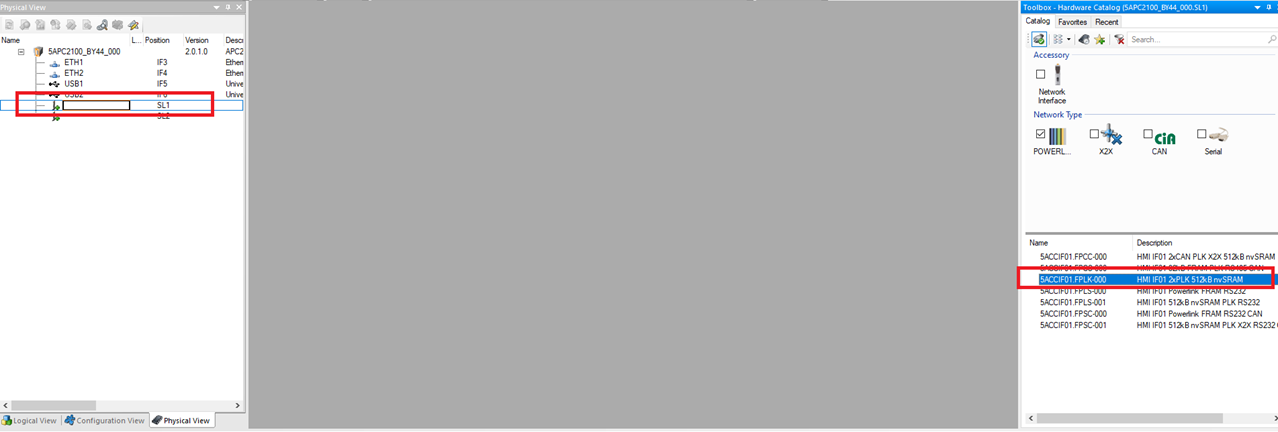 Step 4: In the Physical View select one of the empty module slots and then in the Toolbox – Hardware Catalog click the Powerlink module you are using. This example uses the "5ACCIF01-FPLK-000"