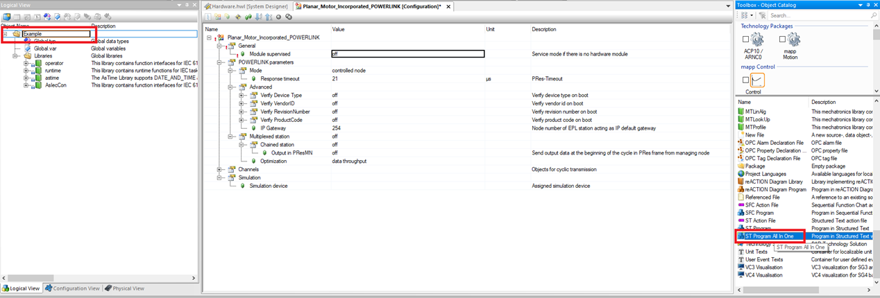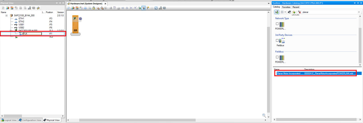 Step 5: Expand the new Powerlink module and select PLK. Then in the Toolbox search for and click the Planar Motor Incorporated Powerlink Module