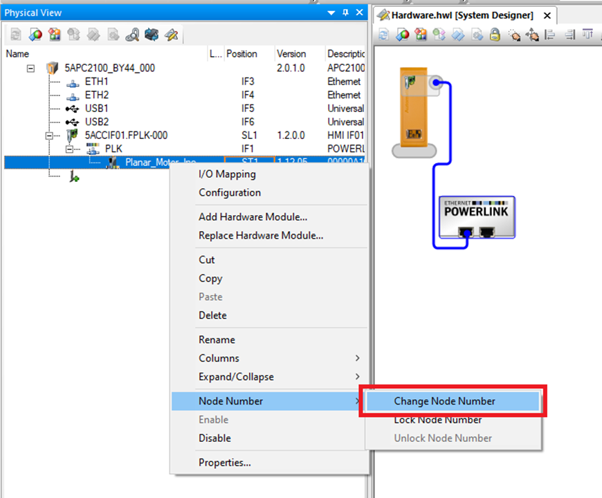 Step 6: Right click the Planar Motor Incorporated Powerlink Module and click Node Number->Change Node Number