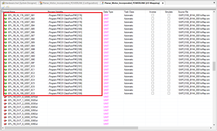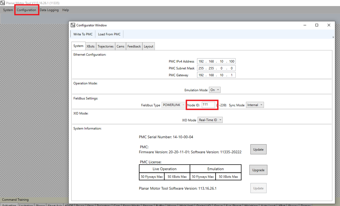 Step 7: The node number for the Planar Motor Incorporated Powerlink Module in B&R Automation Studio needs to match the Node ID in the Planar Motor Tool. You can find the Node ID in the PMT at Configuration->Open Configurator in the System Tab