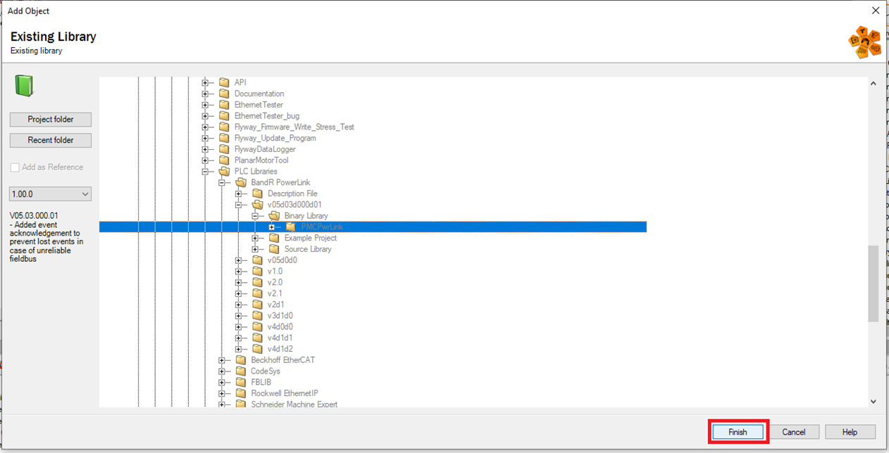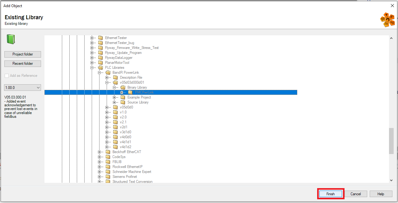 Step 2: In the Add Object window browse to the location of the PMCPwrLink library and click Finish