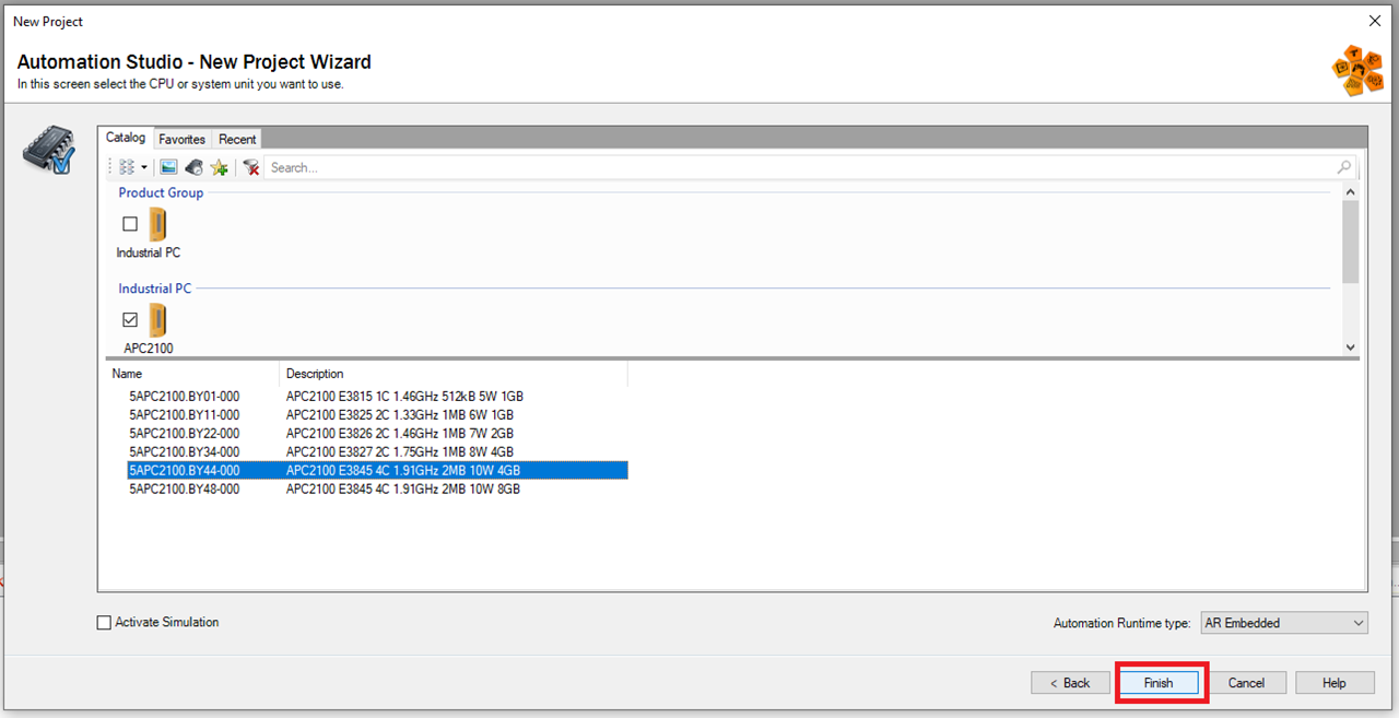 Step 4: Then choose the CPU/system unit you will be using. This example using the 5APC2100.BY44-000. Then click "Finish"