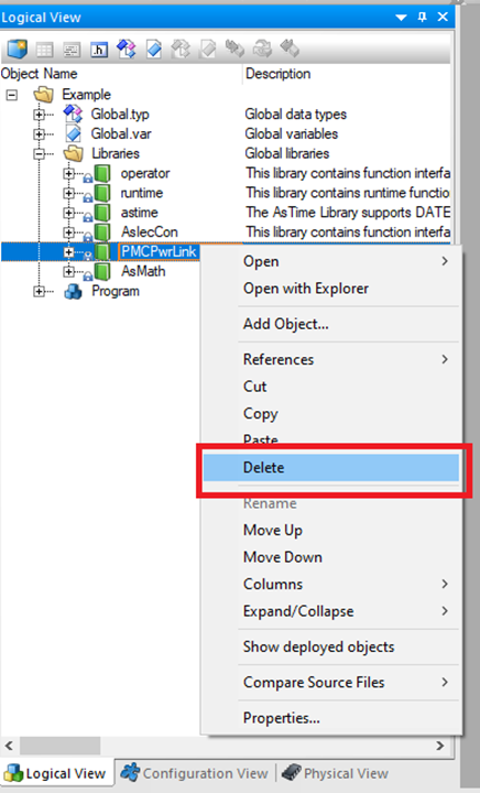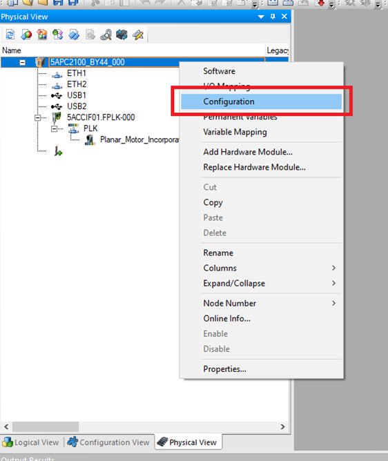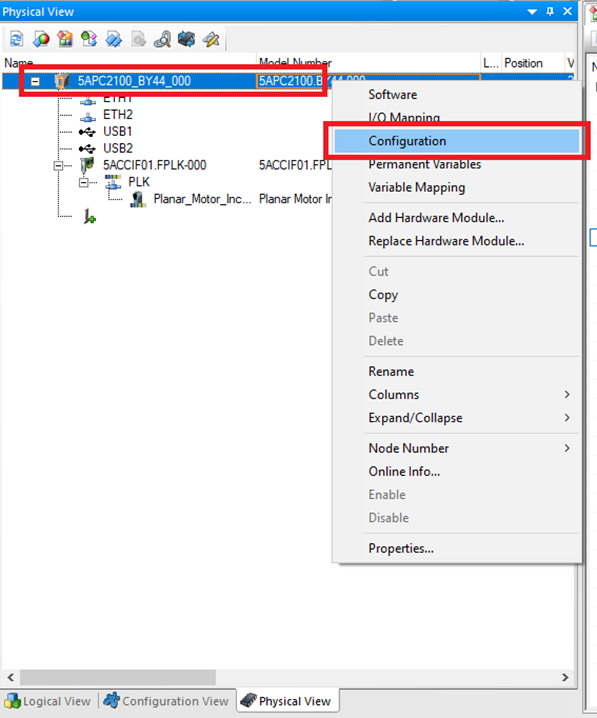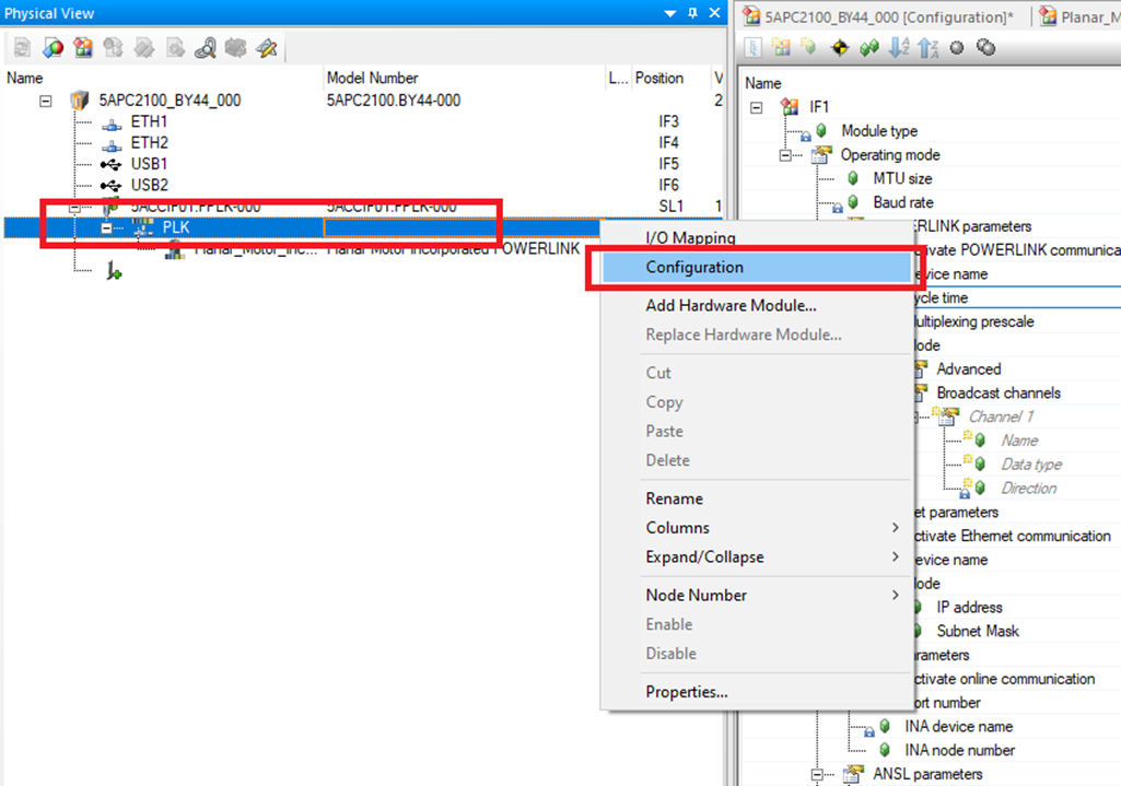 Step 1: In the Physical View expand the Powerlink module that the PMC is connected to and right click "PLK". Then click "Configuration".