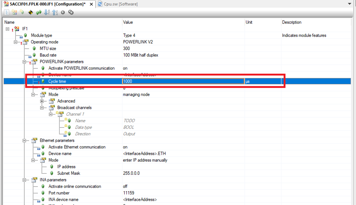 Step 2: In the Configuration window for the module PLK go to Operating mode->POWERLINK parameters and make sure that the Cycle time is the same as the cycle time of the task that communicates with the PMC.