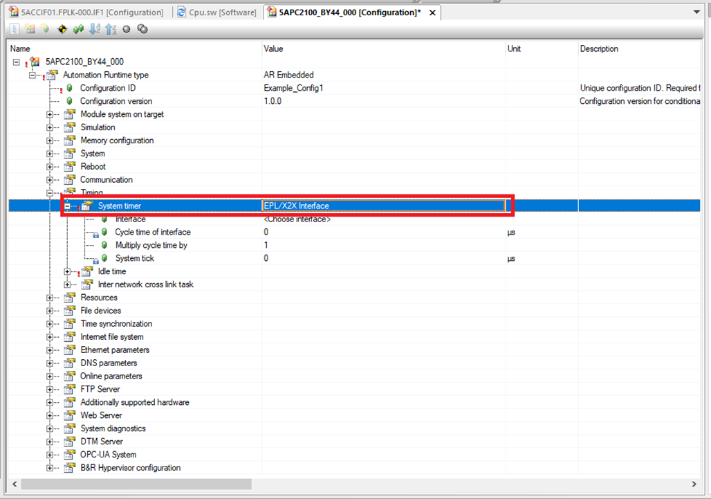Step 4: In the Configuration window for the CPU go to Automation Runtime type->Timing->System timer and change the System timer to EPL/X2X Interface.