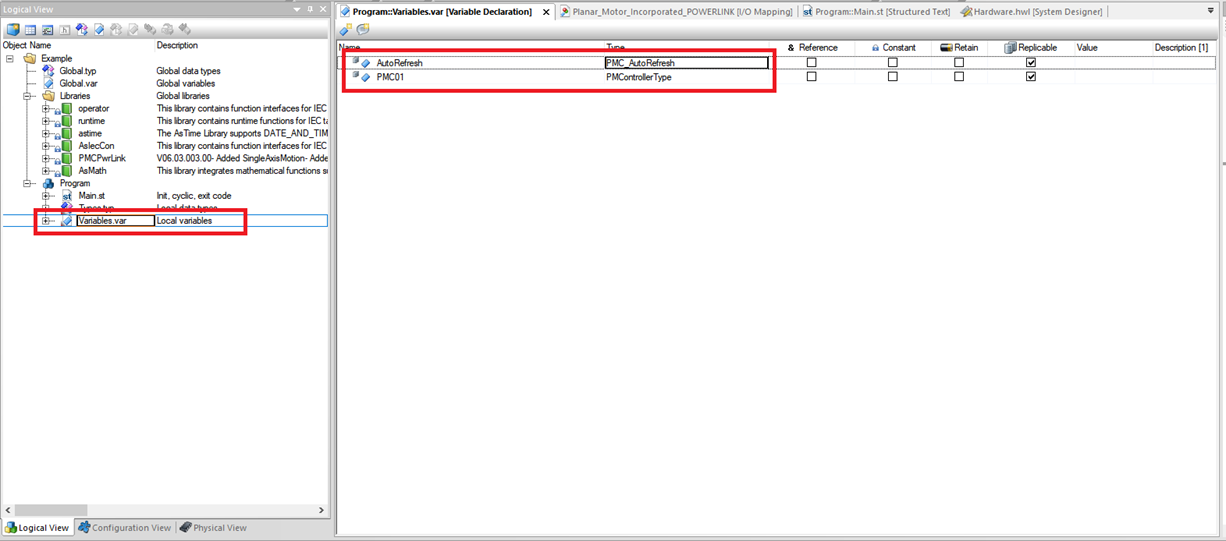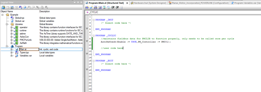 Step 4: Go into Variables.var for the new Program and declare a PMControllerType variable and a PMC_AutoRefresh function block