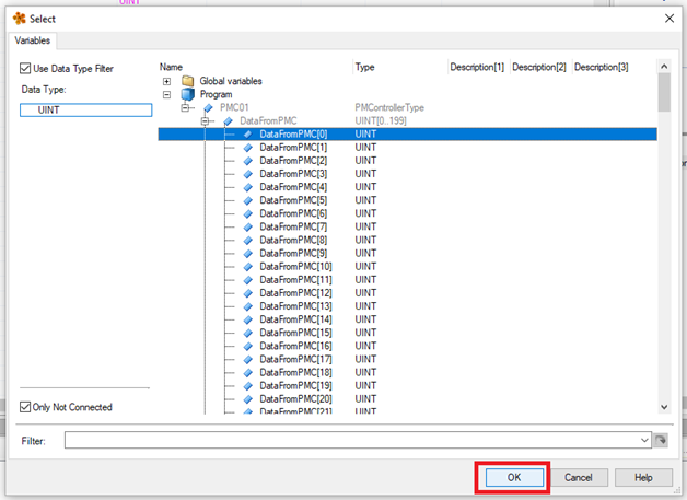 Step 7: Expand the Program then select the first element of the DataFromPMC member of the PMControllerType and click "OK“.