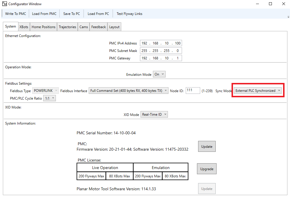 Step 6: In the Planar Motor Tool, open the Configurator, then select “External PLC Synchronized” for the Sync Mode.