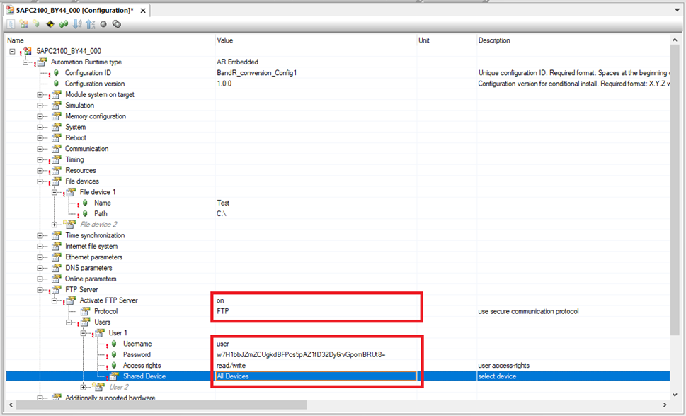 Step 3: Next go to PLC->Automation Runtime type->FTP Server. Switch Activate FTP Server to “on” and select FTP for the Protocol. Then setup a user with read/write Access rights and All Devices for the Shared Device.