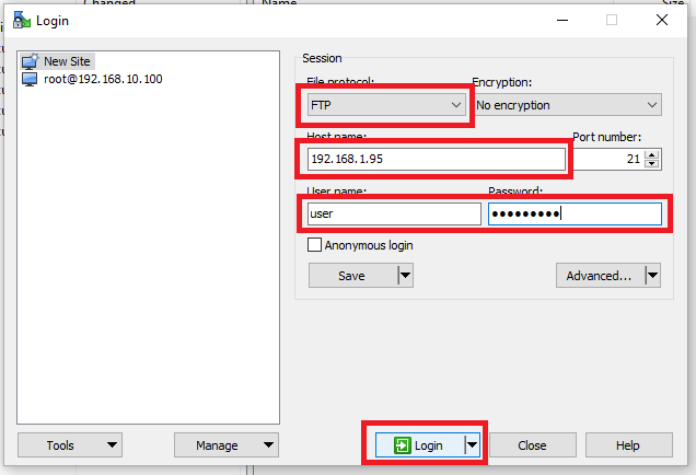 Step 9: In the Login window choose New Site. Choose FTP for the File protocol. The Host name is the IP address of the PLC. Use the Username and Password configured earlier. Then click Login.