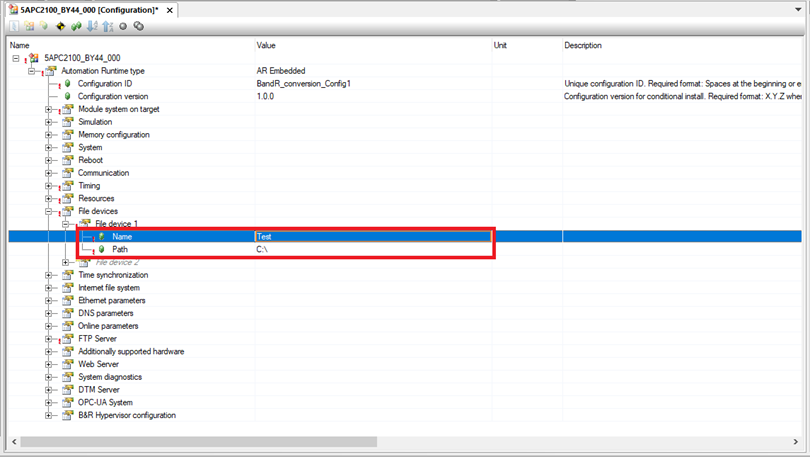 Step 2: In the Configuration window go to PLC->Automation Runtime type->File devices. Create a File device by specifying a name and drive number.