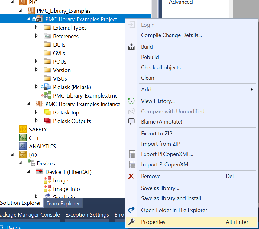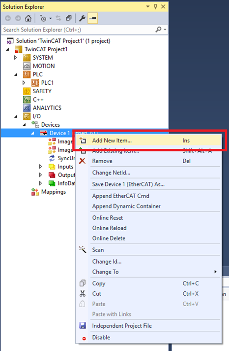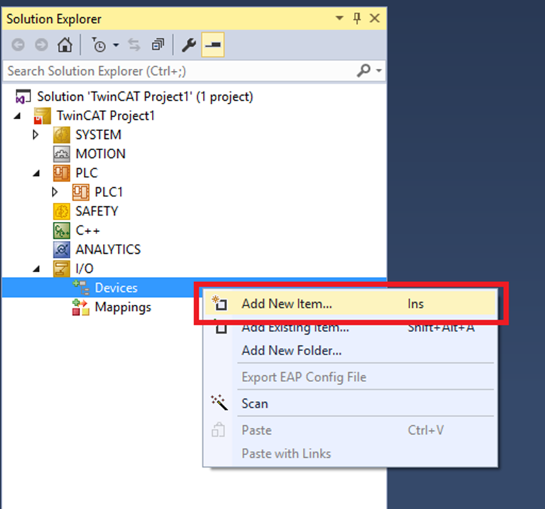 Step 5: In the Solution Explorer go to I/O->Devices and right click the new EtherCAT Master device and click "Add New Item"