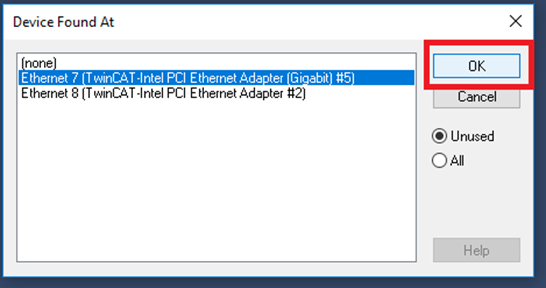 Step 4: In the Device Found At window select the Ethernet Adapter that the PMC is connected to, then click "OK"