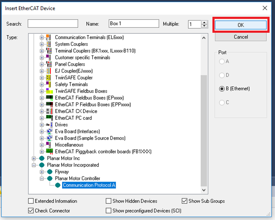 Step 6: In the Insert EtherCAT Device window select Planar Motor Incorporated->Planar Motor Controller->Communication Protocol A then click "OK"