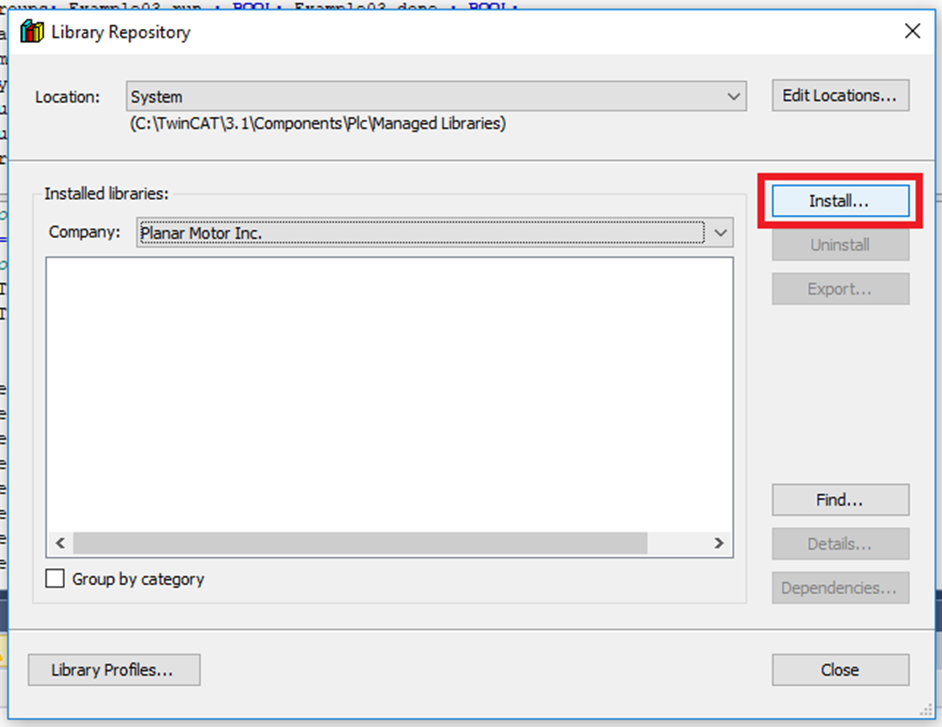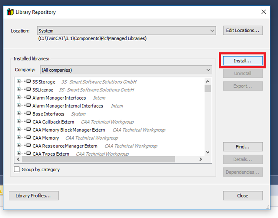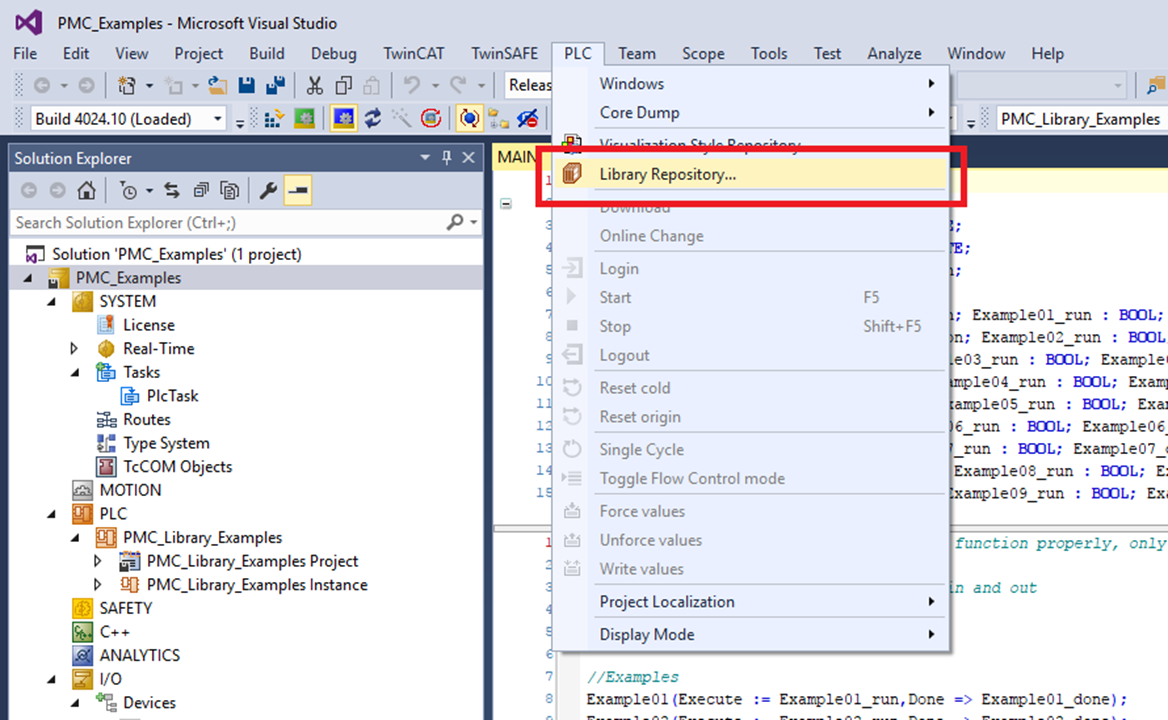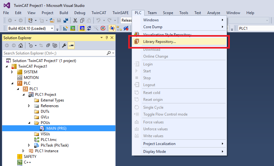 Step 1: (Note library versions are tied to the TwinCAT install not the project) Click PLC->Library Repository