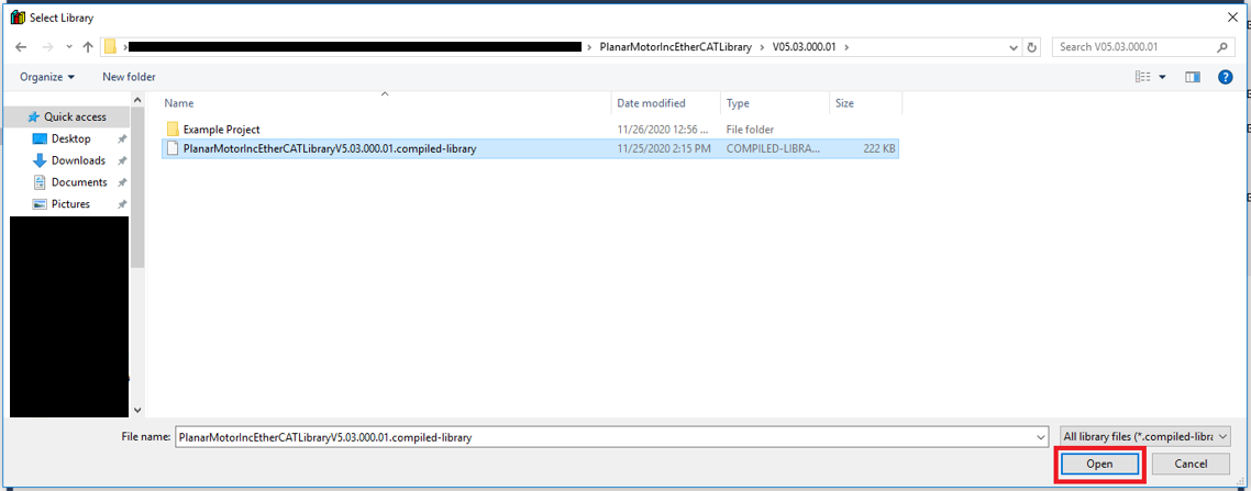 Step 3: Browse to find the included .compiled-library file and click "Open"