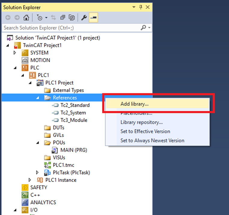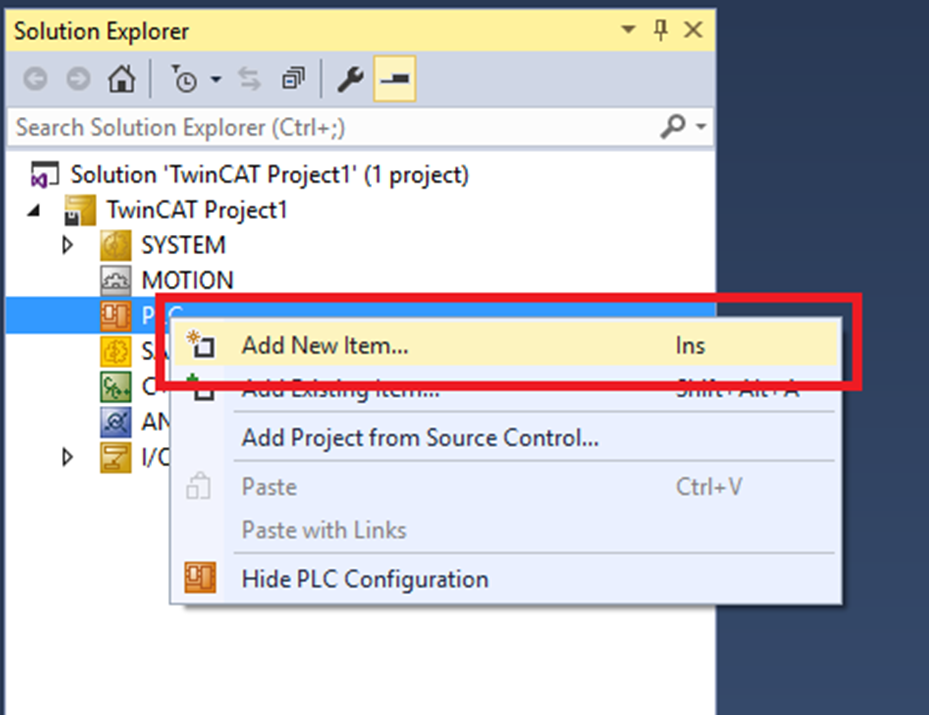Step 3: Once the new TwinCAT XAE project is created go to the Solution Explorer. Expand the new project and right click PLC. Then select "Add New Item"