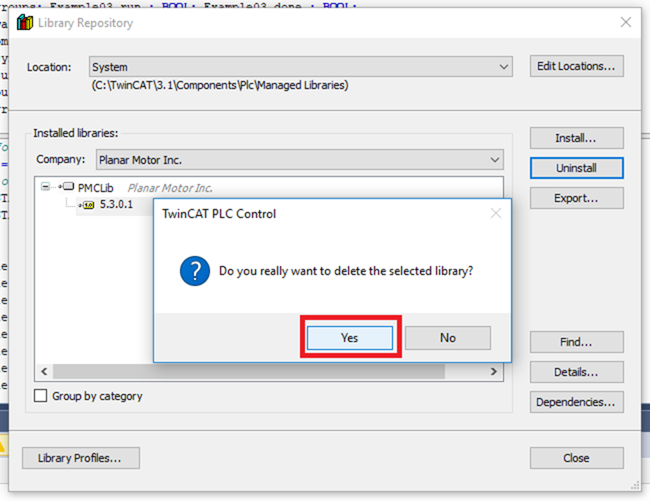 Step 2: In the Library Repository window find PMCLib, select the old version and click "Uninstall"