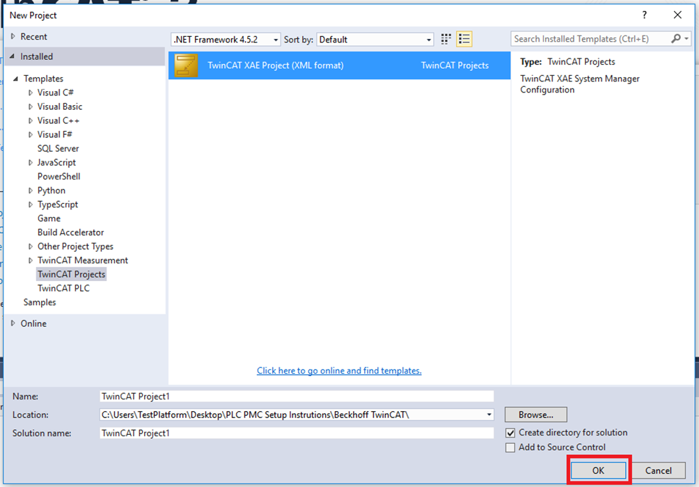 Step 2: In the New Project window select Installed->Templates->TwinCAT Projects and then select TwinCAT XAE Project. Choose a name and location and then click "OK"