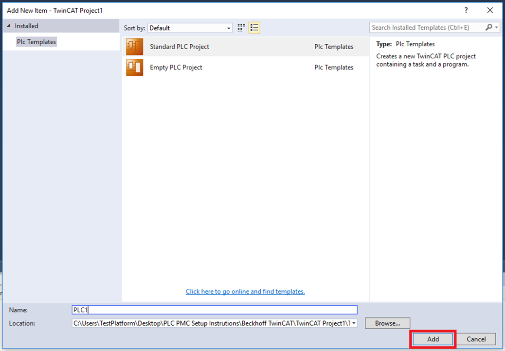 Step 4: In the Add New Item window select Standard PLC Project. Choose a name for the PLC project, then click "Add"