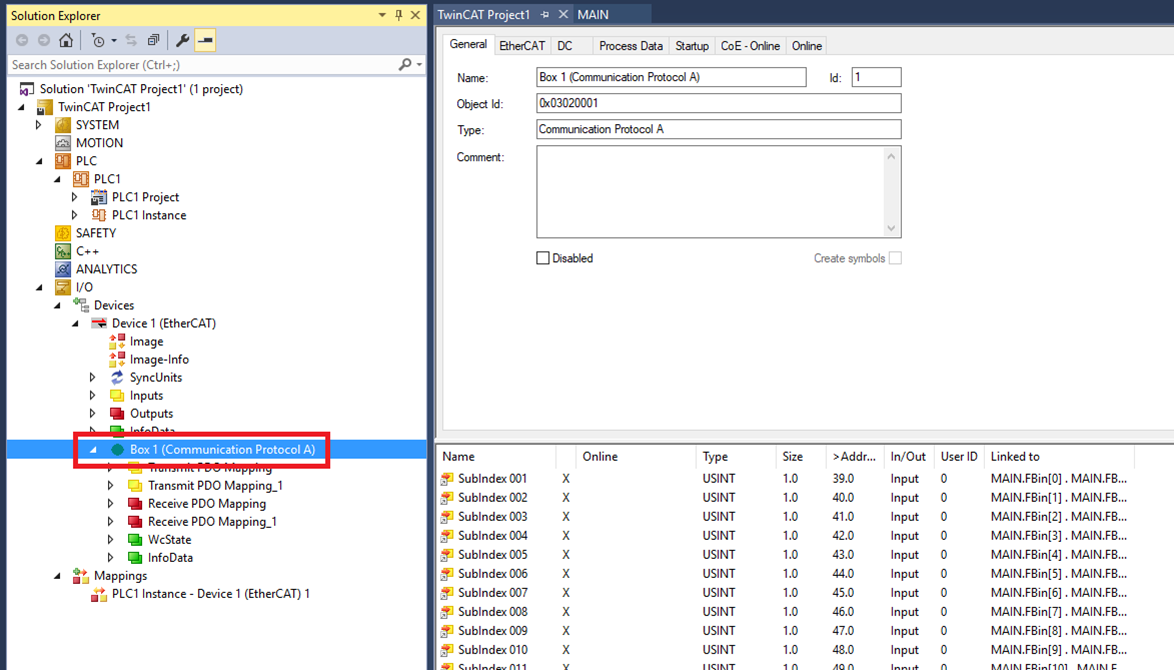 Step 1: Navigate to I/O->Devices and expand the EtherCAT Master device that is connected to the PMC. Then double click the Box 1 (Communication Protocol A) option.