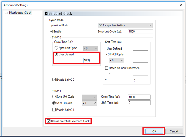 Step 4: In the Advanced Setting window select "User Defined" for the Cycle Time (us). Change the User Defined Cycle Time so that it is equal to the cycle time of the task that communicates with the PMC. Then select "Use as potential Reference Clock" and then click "OK".