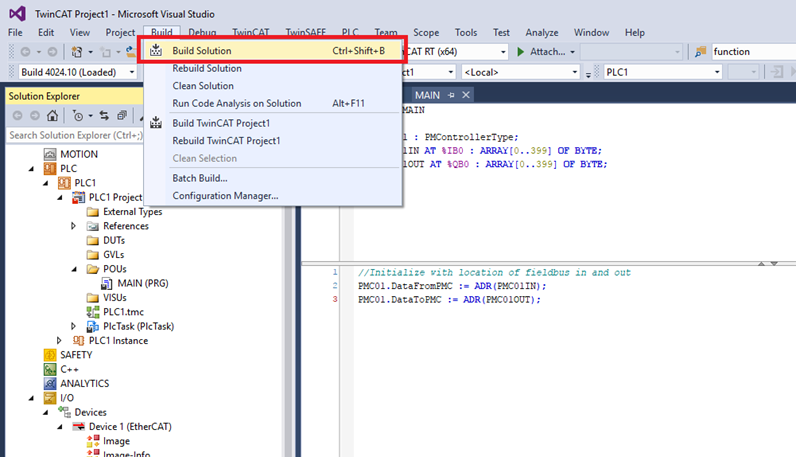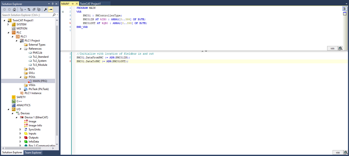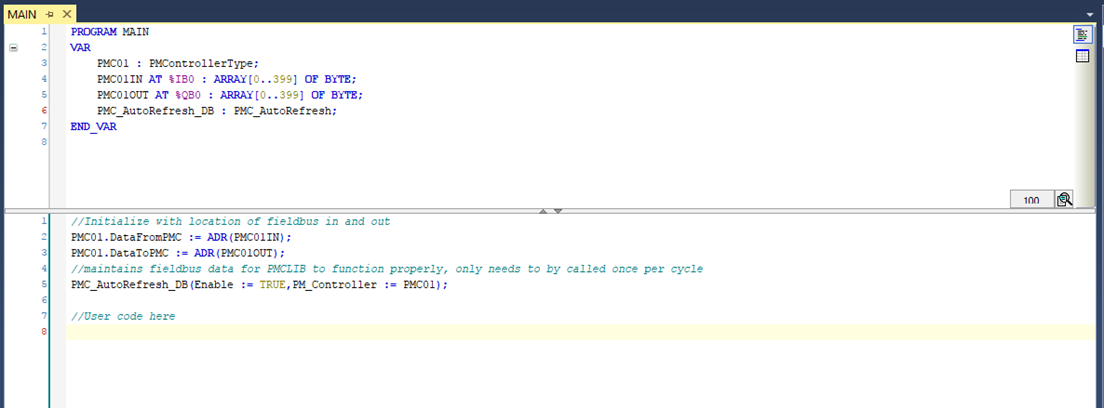 Step 6: Next expand the PLC->PLC project->POUs and open MAIN. There declare a PMControllerType and two arrays. One array is a 400 element array of type BYTE declared at a fixed input address (ex. %IB0) of the PLC. The other is a 400 element array of type BYTE declared at a fixed output address (ex. %QB0) of the PLC. The exact input and output addresses don’t matter, but it must not overlap with any other input and output variables.