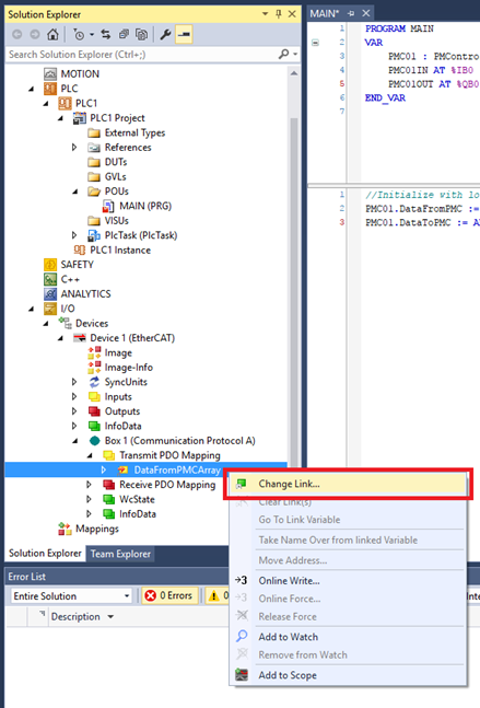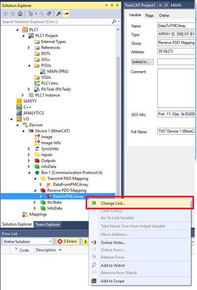 Step 10: Right click I/O->Devices->EtherCAT Master Device Name->Box 1 (Communication Protocol A)->Transmit PDO Mapping->DataToPMCArray then click Change Link…