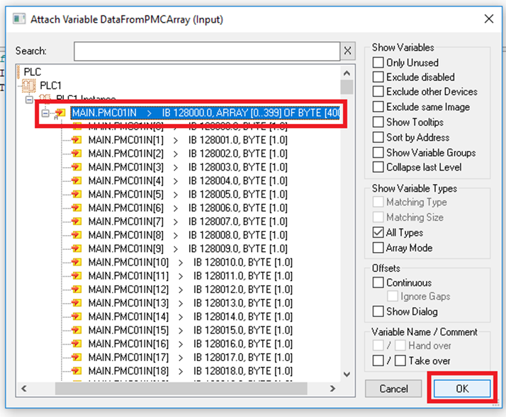 Step 9: Once in the Attach Variable window, make sure that the Show Variables and Show Variable Types selections are set the same as here. Then select the array that you declared in the input (%IB) area of the PLC.