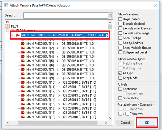 Step 11: Once in the Attach Variable window, make sure that the Show Variables and Show Variable Types selections are set the same as here. Then select the array that you declared in the output (%QB) area of the PLC.