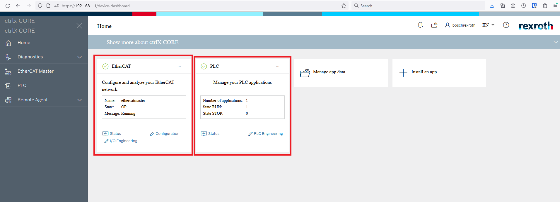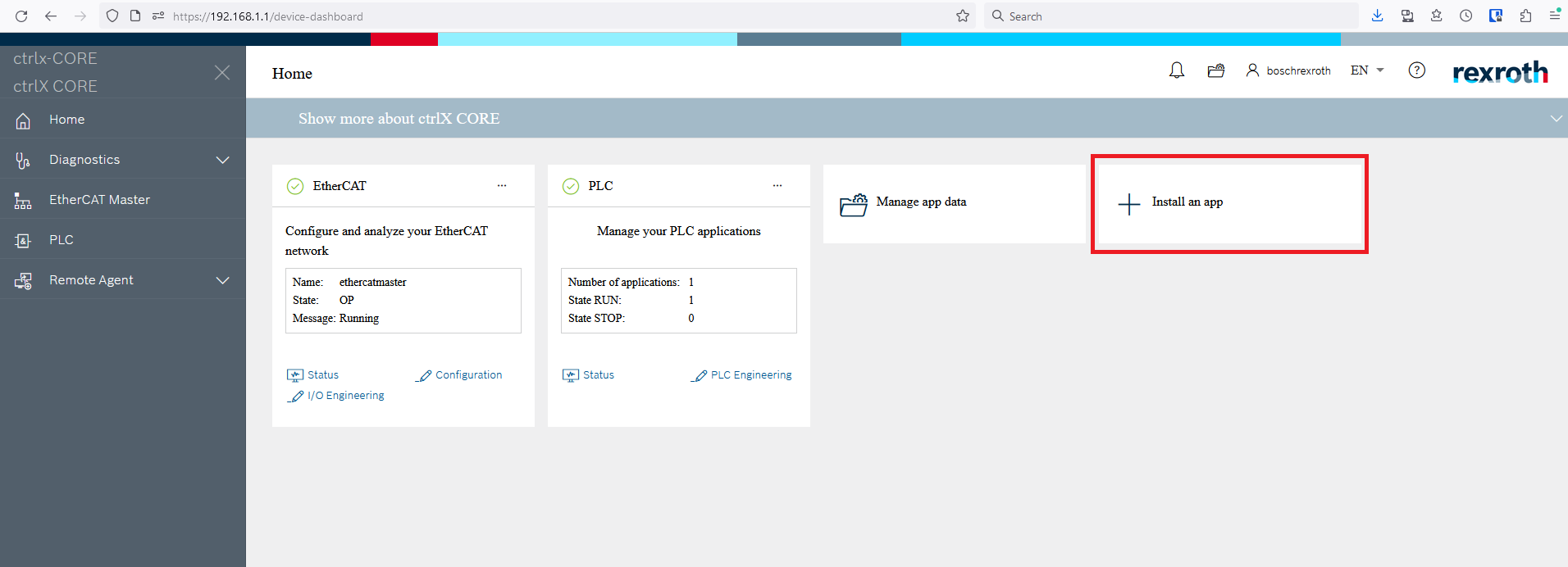 Step 1: First you need to install the PLC and EtherCAT apps onto the ctrlX Core. In a web browser connect to the controller (default IP 192.168.1.1). Any apps you already have installed will be listed on the home page