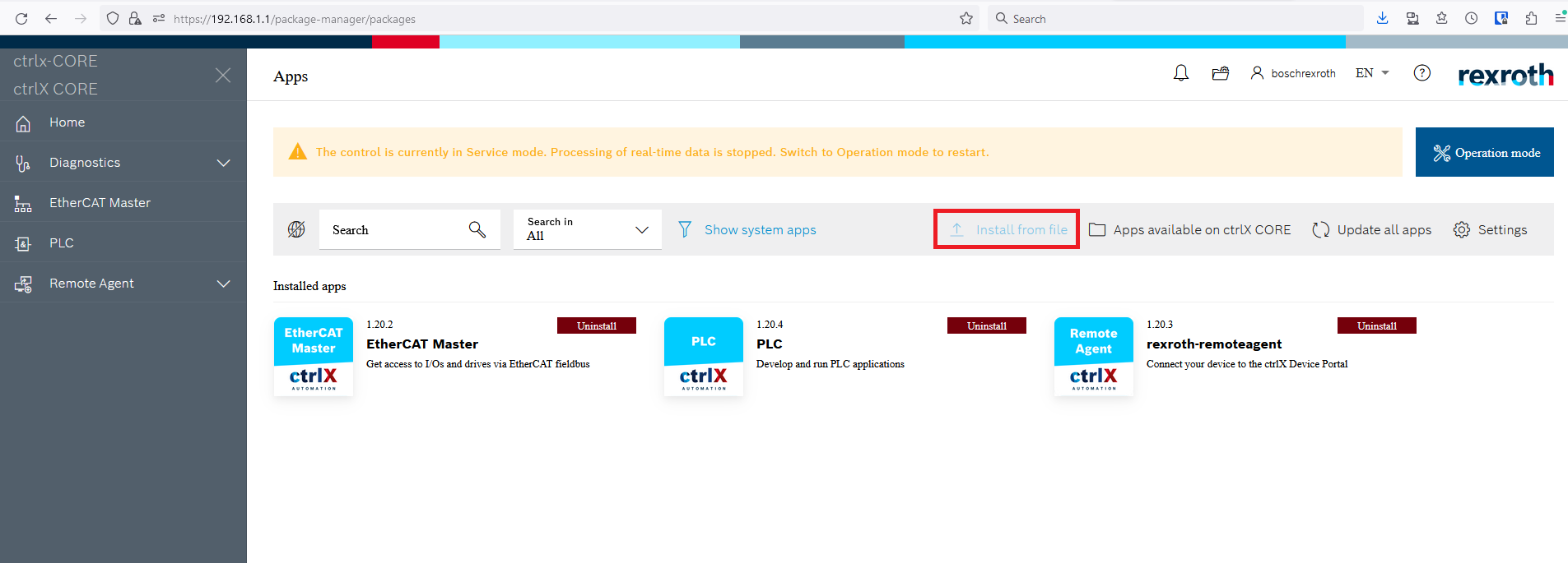 Step 5: If the controller doesn’t have an internet connection then you can click the Install from file button to install app files downloaded from the Bosch Rexroth website