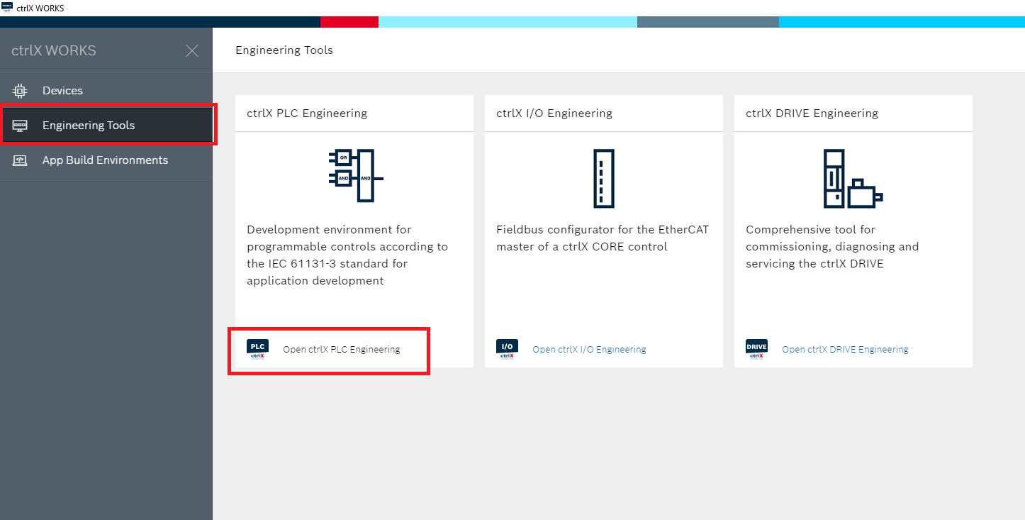Step 2: In the Engineering Tools tabs click the Open ctrlX PLC Engineering button. This program is for editing the PLC program itself