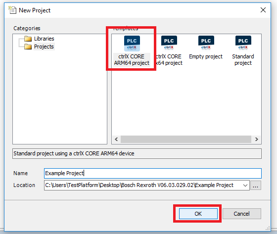 Step 4: In the New Project window select the type of ctrlX controller you are using; for this example an ARM64. Give the project an unique name and choose its location. Then click OK