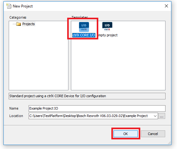 Step 8: In the New Project window choose ctrlX CORE I/O as the template. Give the project an unique name and location. Then click OK