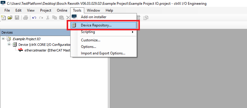 Step 1: In the I/O configuration project click Tools->Device Repository