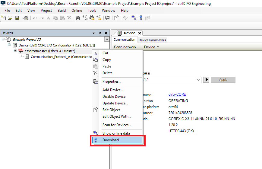 Step 11: In the Devices tree right click the EtherCAT Master and click Download. If the EtherCAT is already running click Yes in the window asking to enter Init state