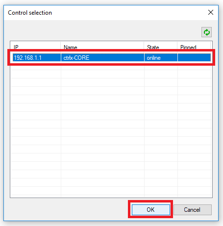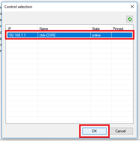 Step 9: In the Control selection window select the ctrlX controller and click OK