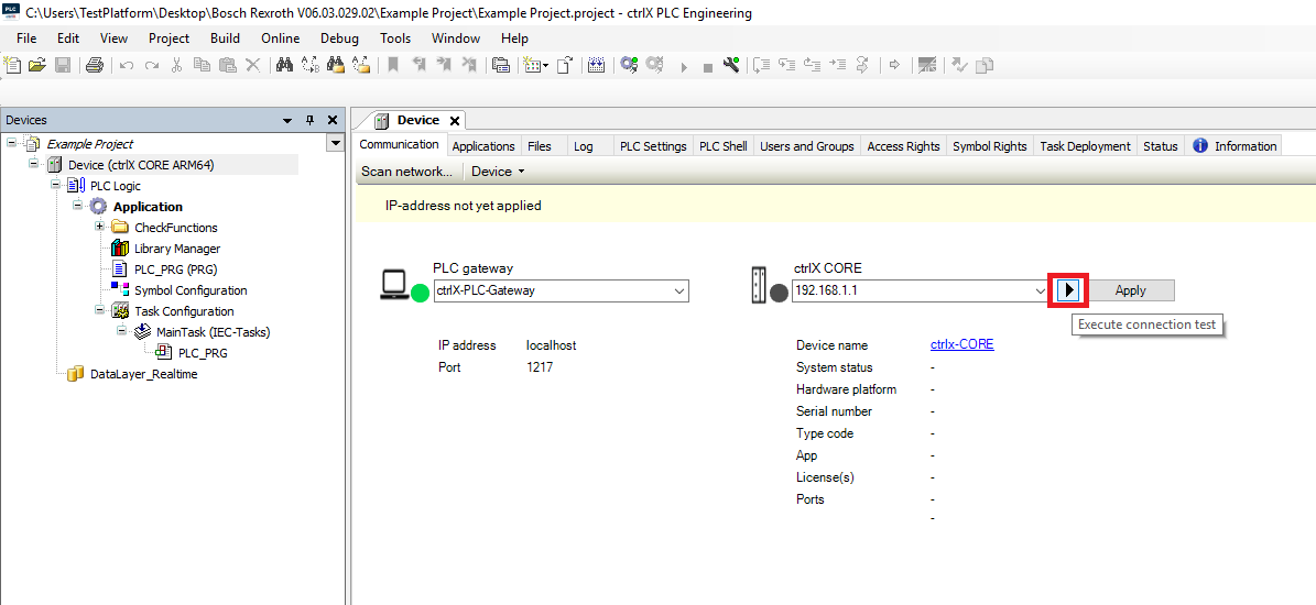 Step 15: In the Device Communication tab click the > “Execute connection test” button then click Apply