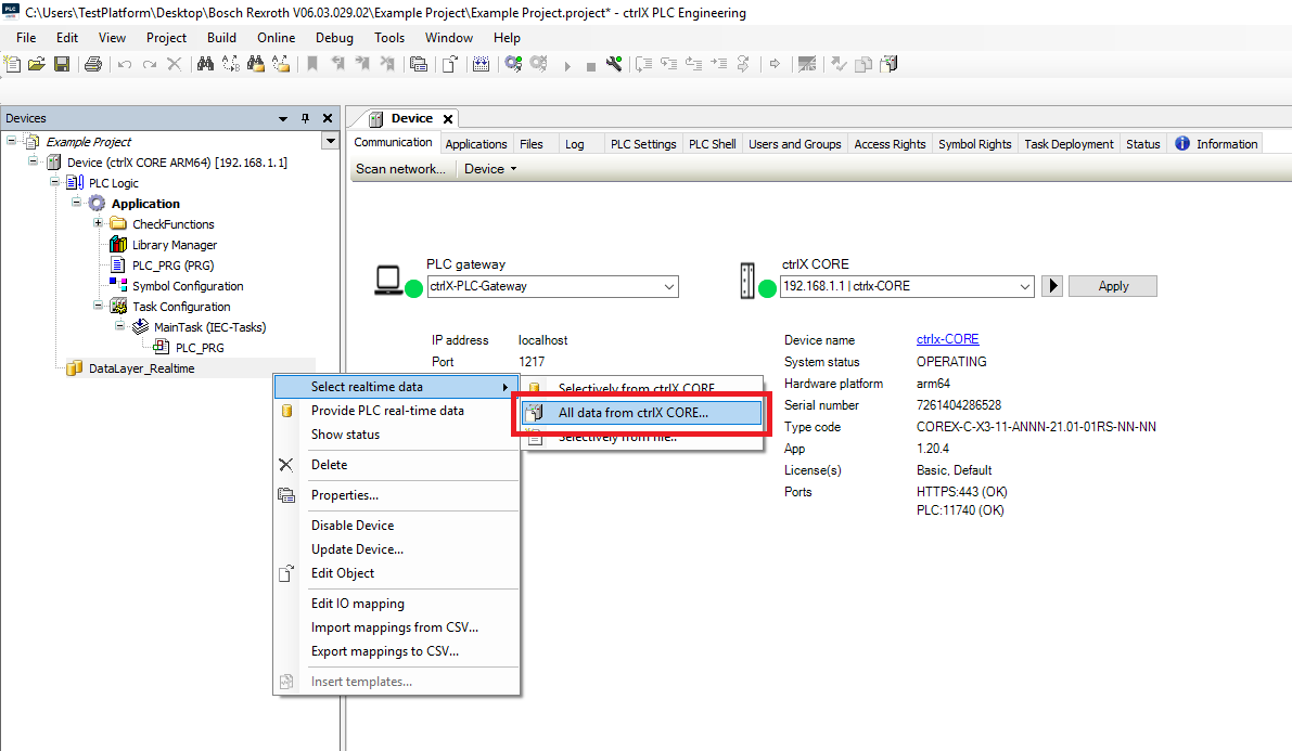 Step 16: In the Devices tree right click the DataLayer_Realtime and click Select realtime data->All data from ctrlX CORE
