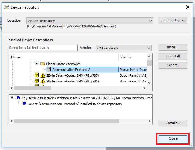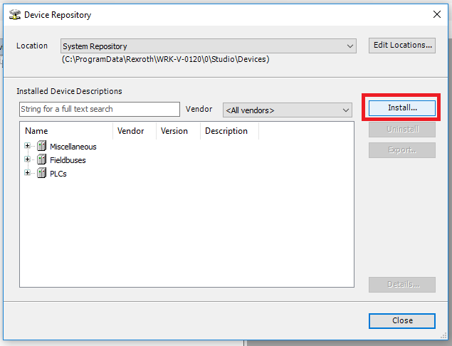 Step 2: In the Device Repository window click the Install button