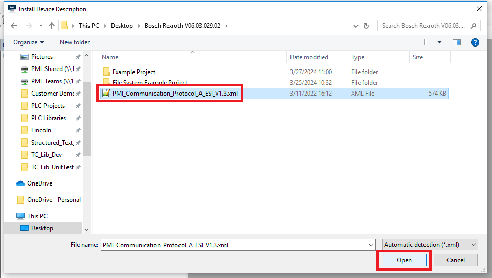 Step 3: In the Install Device Description window navigate to the location of the PMC ESI xml file, select it and click Open