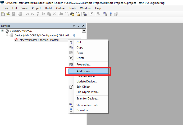 Step 5: In the Devices tree right click on the EtherCAT Master and click Add Device