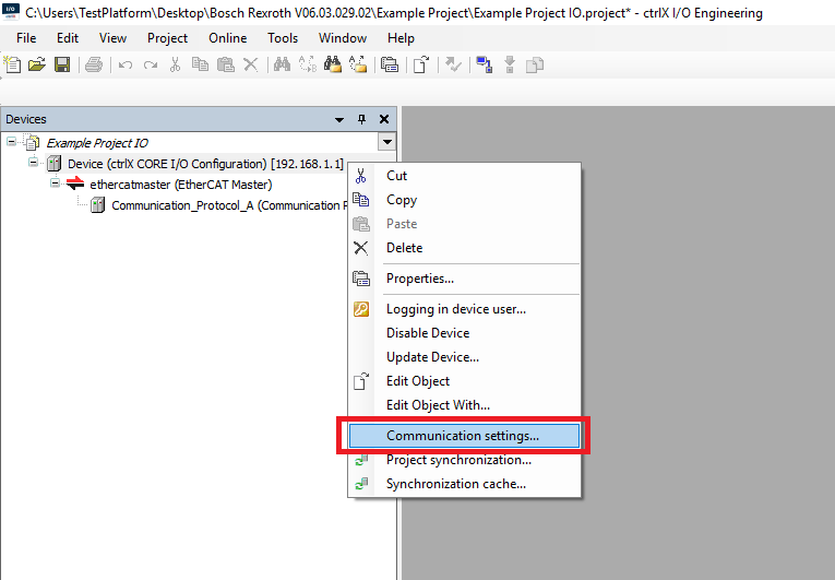 Step 7: To load the EtherCAT configuration to the controller right click the controller in the Devices tree and click Communication settings