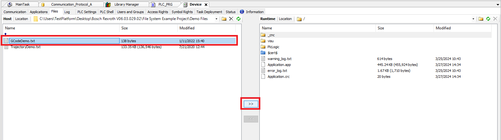Step 2: To upload file(s) onto the controller select the file(s) on the left (PC) side and then click the >> button