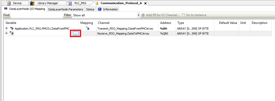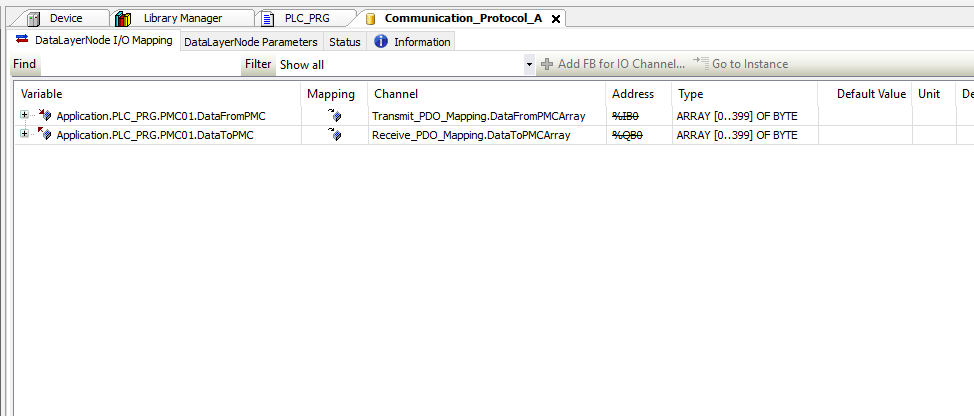 Step 8: In the Devices tree open the PMC device Communication_Protocol_A. In the Communication_Protocol_A window select the DataLayerNode I/O Mapping tab. Change the Always update variables setting to Enable 2 (always in bus cycle task)